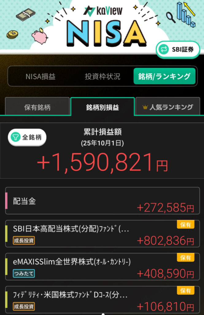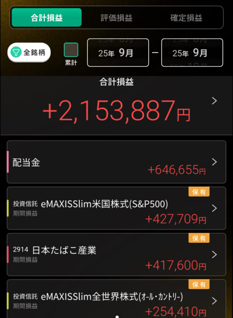 2025年9月は配当金含め、約210万円の評価益となりました。
