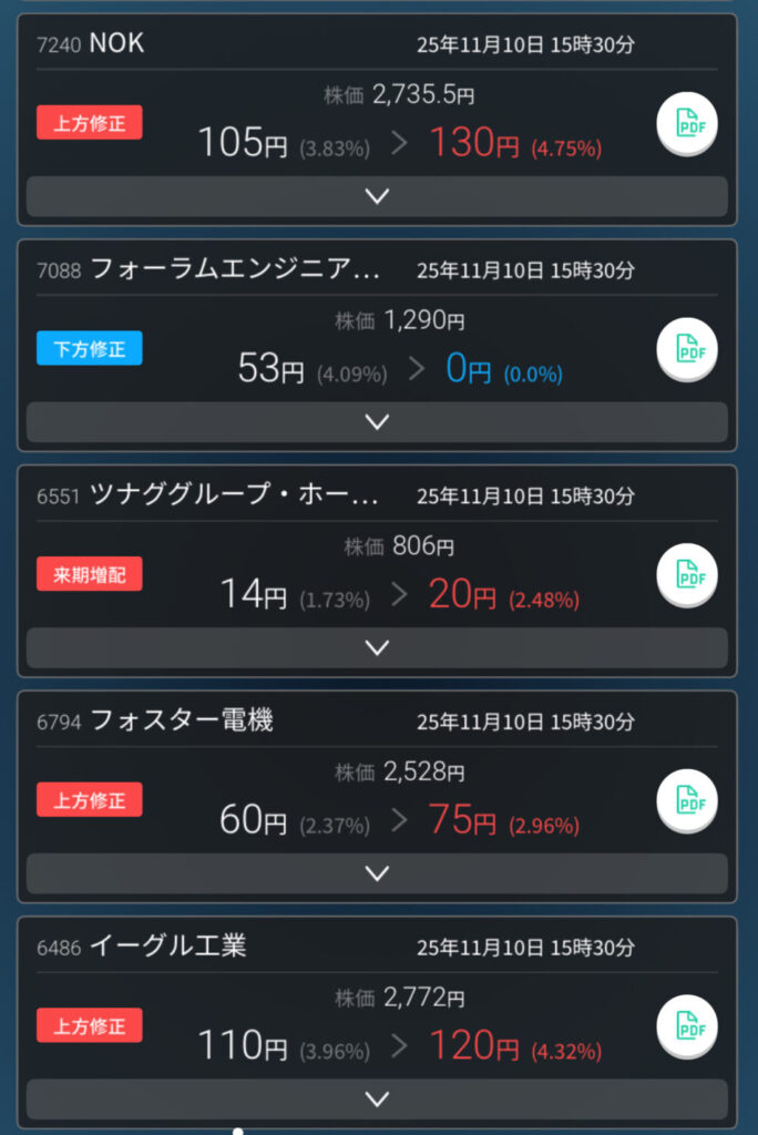 下記のように決算があった銘柄ごとに増配、減配などをお知らせしてくれます。